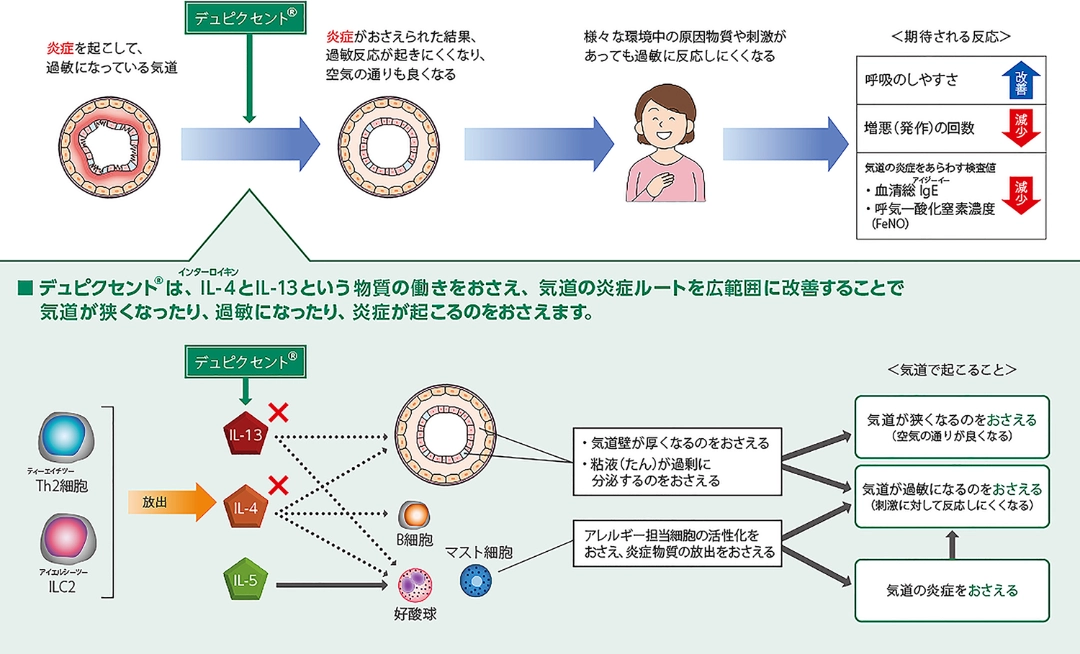 デュピクセントを投与することで、空気の通りを良くし、色々な刺激に対しても発作や咳を出にくくします。