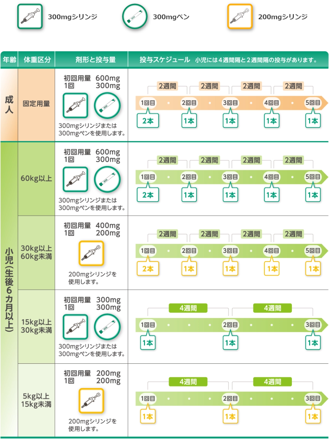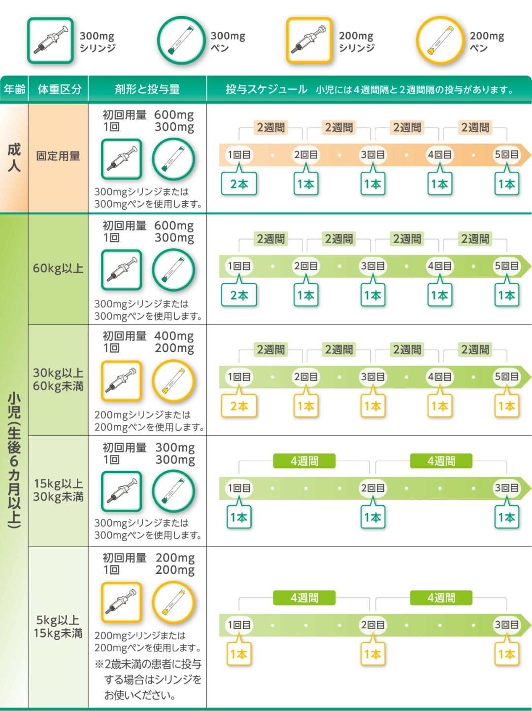 - 生後6カ月以上の小児には、体重に応じて決められた用法及び用量で皮下投与します。