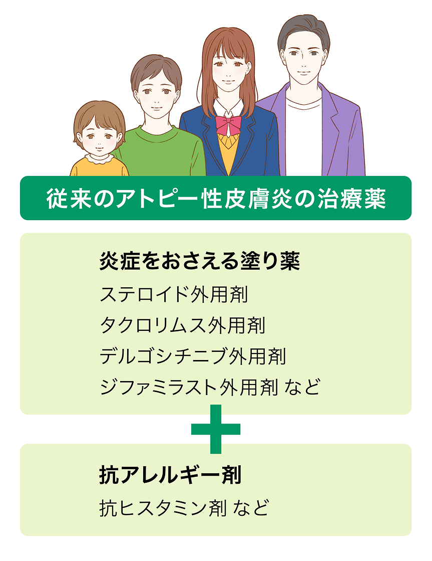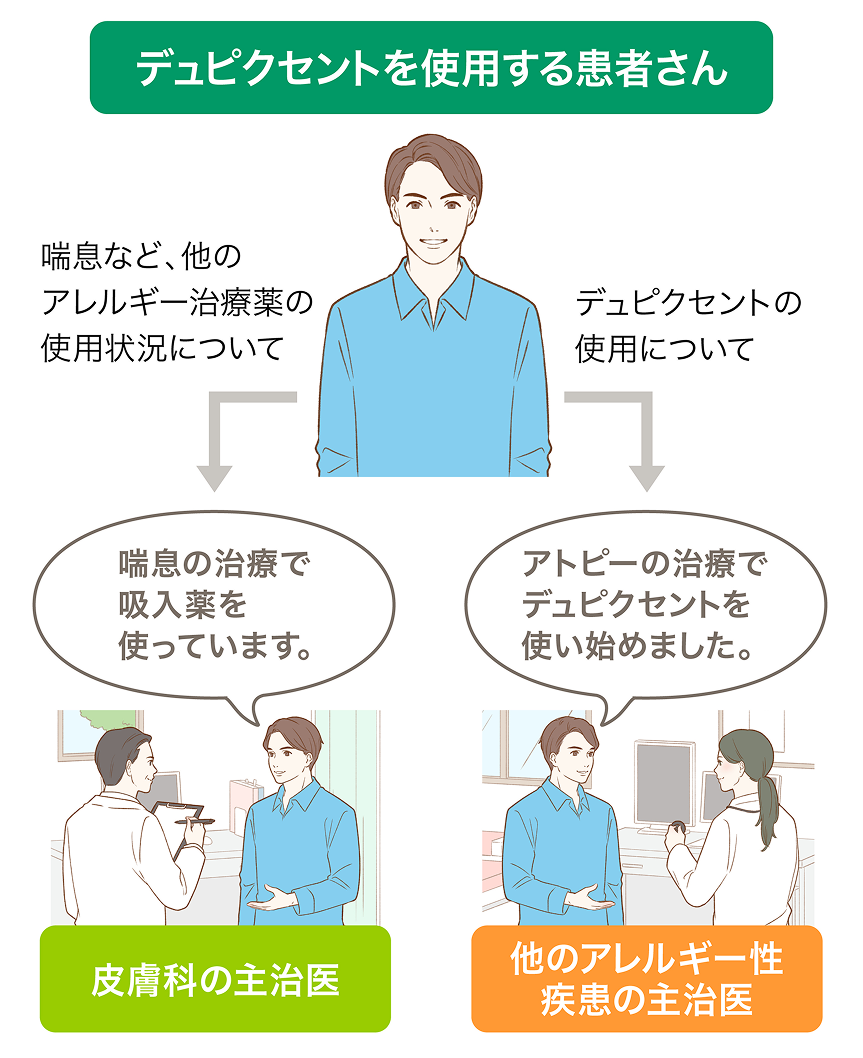 アトピー性皮膚炎以外のアレルギー性疾患(喘息、慢性副鼻腔炎、アレルギー性鼻炎、じんましんなど)をお持ちの患者さんは主治医に伝えてください。