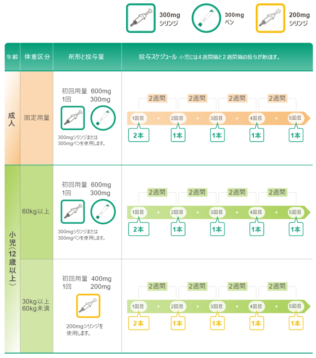 - 12歳以上の小児の患者さんには、体重に応じて決められた用法及び用量で皮下投与します。